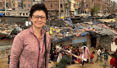 In the photo, Kayoko is pictured outside one of the slums in Delhi, where she and one of Hanaru's Ambassadors distributed sanitary napkins.