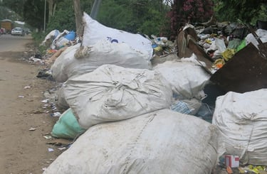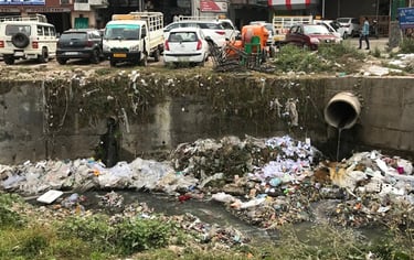 Rubbish disposal is a huge problem in India. Rubbish is dumped everywhere, and can build up for hundreds of meters on roadsides on the outskirts of towns. When part of a city's garbage 'mountain' catches fire, it can burn for days, releasing toxic chemicals into the air. There are challenges to infrastructure capacity, segregation, handling and allocation of finances for future improvements.