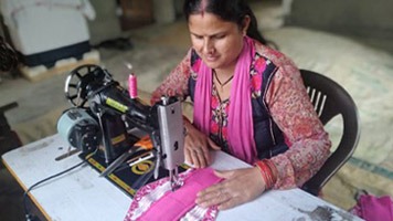 Our napkins are handmade by women in their own homes. They are given lengths of both fabrics to take home, and they can make the napkins when it best suits them. They mainly use hand-crank sewing machines, and we loan them a machine if they don't own one. We also loan them a manual hand press set for applying the fastening snaps.
