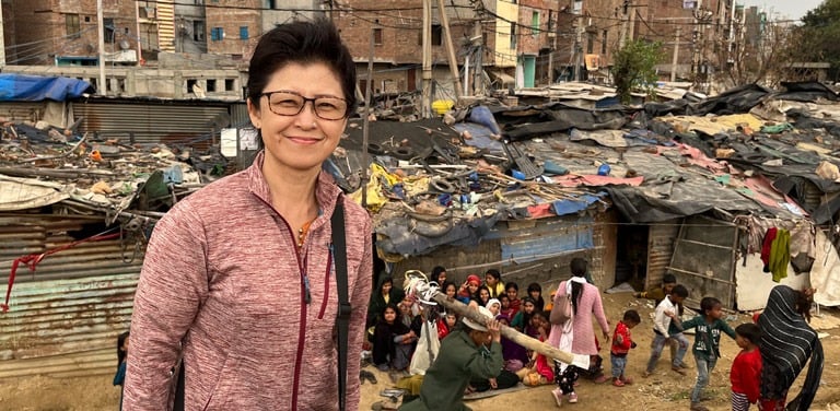 In the photo, Kayoko is pictured outside one of the slums in Delhi, where the Charity distributed Napkin Packs to some of the girls.